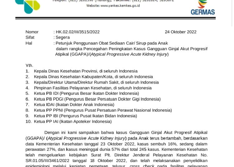 “Kementerian kesehatan RI akan mengeluarkan surat pemberitahuan kembali setelah diperoleh hasil pengujian Badan POM RI atas jenis obat obatan sirup lainnya,” tambahnya