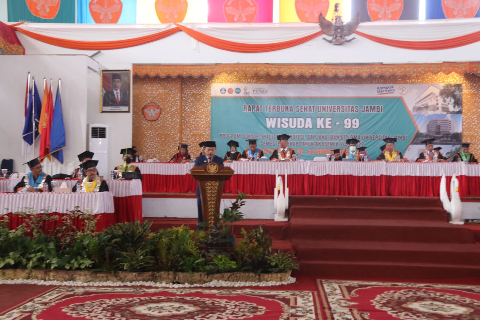 Rektor UNJA Prof.Drs.H.Sutrisno,M.Sc.,Ph.D., menyampaikan, pelaksanaan wisuda ke-99 kali ini berlangsung secara tatap muka dengan tetap memperhatikan prosedur protokol kesehatan covid-19. Pada periode wisuda ke-99 ini, UNJA mewisuda sebanyak 1.726 orang wisudawan.