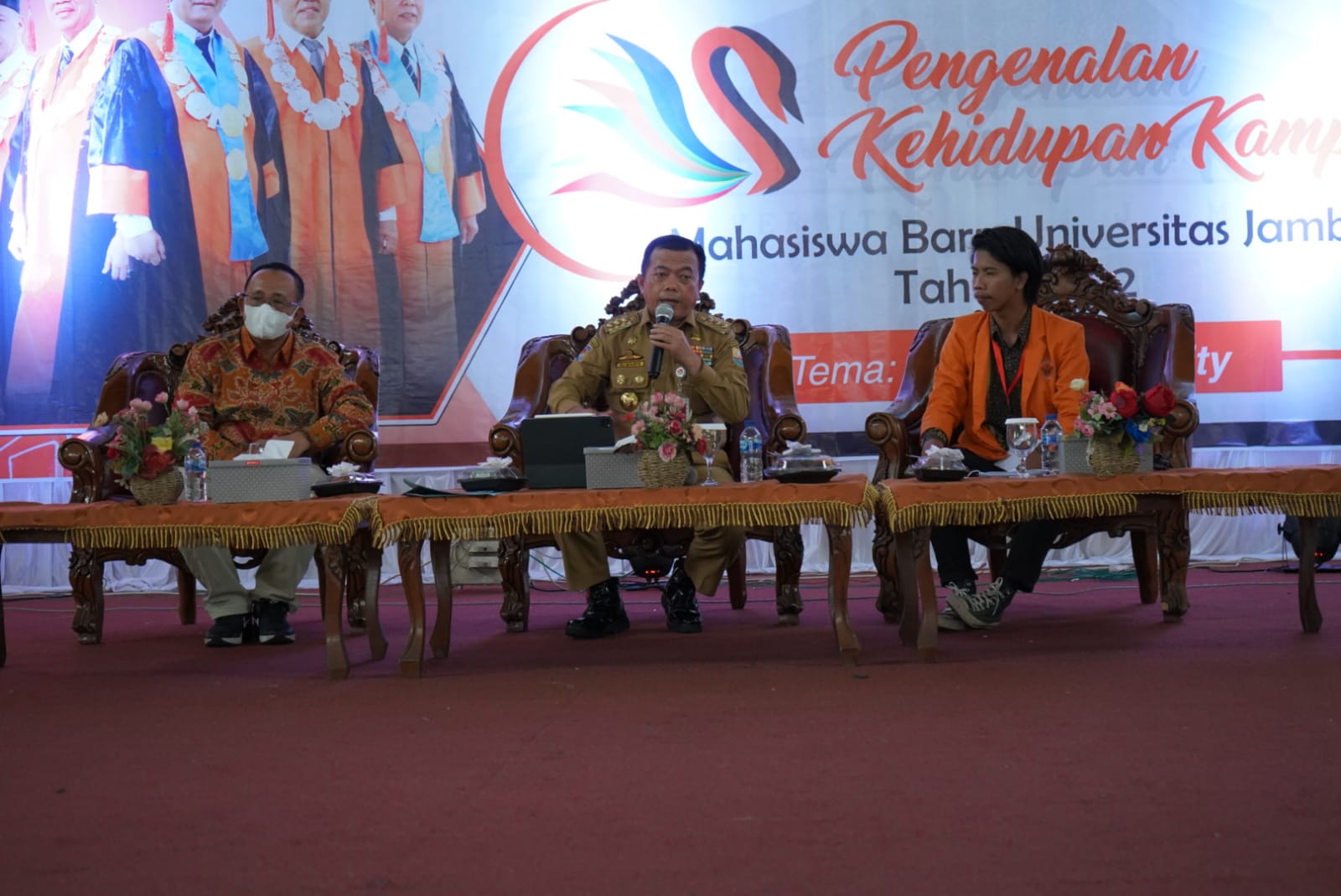 Mendalo – Gubernur Jambi Dr.H.Al Haris,S.Sos.,M.H., memberikan motivasi secara langsung mahasiswa baru Universitas Negeri Jambi (UNJA) dalam menghadapi dan menyikapi era teknologi 4.0. Hal tersebut disampaikan Al Haris saat menjadi Narasumber Kegiatan Pengenalan Kehidupan Kampus Mahasiswa Baru (PKK-MB) UNJA, bertempat di Balairung Universitas Jambi, Mendalo Darat, Kabupaten Muaro Jambi, Selasa (09/08/2022).