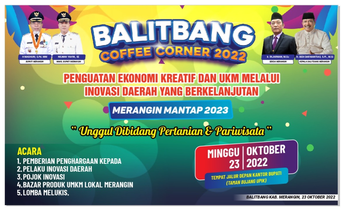 Merangin – Dalam mewujudkan pemberian penghargaan kepada pelaku Inovasi dan memberi ruang media UMKM untuk mempromosikan produk unggulan daerah seperti kopi lokal Merangin serta sebagai unjuk kreativitas bagi generasi muda Merangin, Badan Penelitian dan Pengembangan (Balitbang) Kabupaten Merangin akan menggelar Balitbang Coffee Corner Tahun 2022.