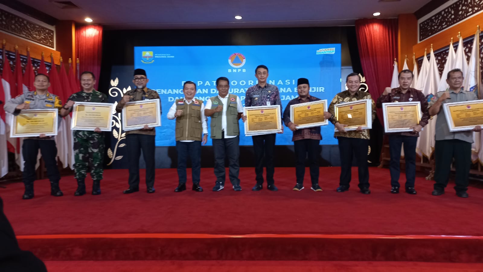 Penyerahan bantuan BNPB masuk dalam rangkaian Rapat yang dihadiri oleh Kepala Daerah Kabupaten dan kota di wilayah Provinsi Jambi, Danrem 042/Garuda Putih, Kepala Biro Operasional Polda Jambi, serta OPD (Organisasi Perangkat Daerah) terkait lainya.