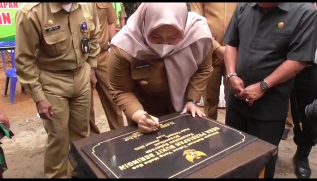 Peresmian ditandai dengan membuka tirai papan merk kantor Desa Persiapan Bukit Beringin dan penandatanganan prasasti oleh Bupati Hj. Masnah Busro. (Adv)