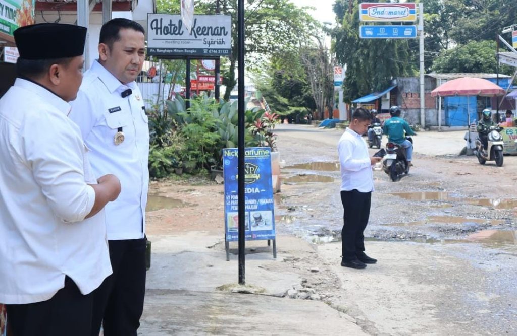 Merangin – Bupati Merangin H M Syukur bersama Kadis Pekerjaan Umum dan Penataan Ruang (PUPR) Merangin Zulhifni, meninjau kondisi Jalan Rangkayo Hitam tepatnya di depan Hotel Keenan Bangko yang sudah lama kondisinya rusak, Rabu (05/3/2025)