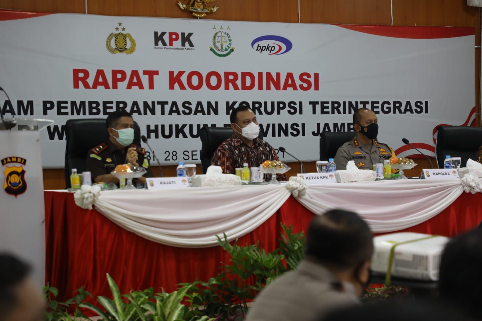 Jambi – Dalam rangkaian pelaksanaan program pemberantasan korupsi terintegrasi di wilayah Provinsi Jambi selama 5 hari mulai  dari tanggal 27 September 2021 sampai dengan 1 Oktober 2021, Komisi Pemberantasan Korupsi (KPK) menggelar beberapa kegiatan dimana salah satunya Rapat Koordinasi dan  pertemuan dengan jajaran Aparat Penegak Hukum (APH)  dari Kepolisian Daerah (Polda) Jambi, Kejaksaan Tinggi (Kejati) Jambi, dan Perwakilan Badan Pengawasan Keuangan dan Pembangunan (BPKP) Provinsi Jambi, di Kantor Polda Jambi, Selasa (28/9/2021