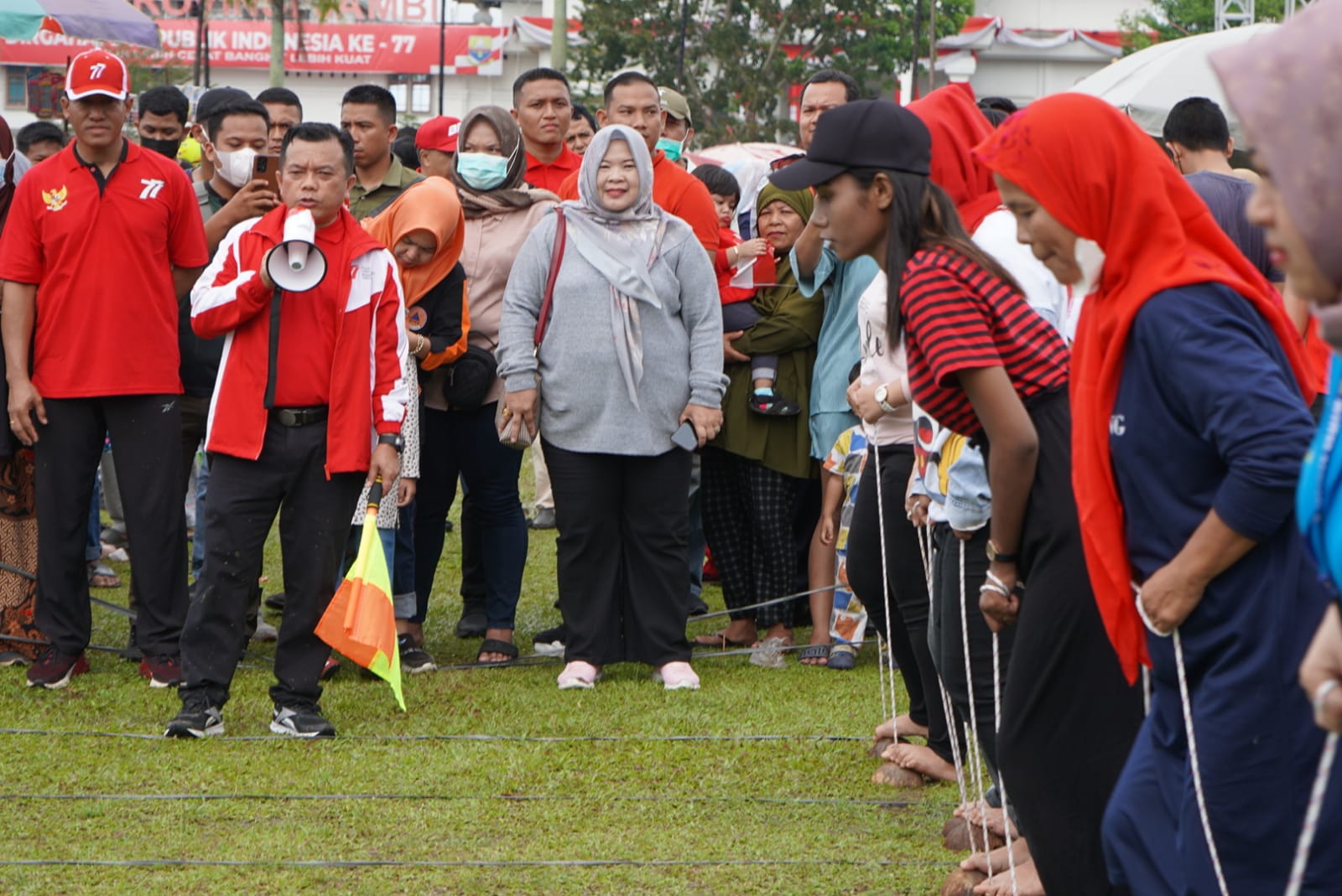 Gubernur Jambi, Al Haris beserta Istri Hesnidar Haris, Wakil Gubernur Jambi, Abdullah Sani, Sekda Pemprov Jambi dan para pejabat eselon II, serta jajaran terlihat mengikuti kegiatan permainan yang dilombakan seperti lari dalam karung.
