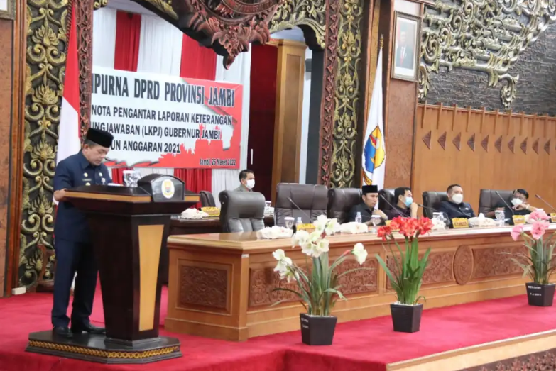 Jambi – Gubernur Jambi Dr.H.Al Haris,S.Sos.M.H, menyampaikan nota pengantar laporan keterangan pertanggungjawaban (LKPJ) tahun anggaran 2021 pada rapat paripurna DPRD Provinsi Jambi, Sabtu (26/03/2022).