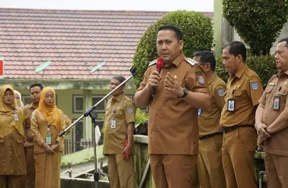 Merangin – Bupati Merangin H M Syukur hari pertama masuk kerja pasca Lebaran Idul Fitri 1446 H, mengambil apel di halaman depan Rumah Sakit Daerah Kol Abundjani Bangko, Selasa (08/4)