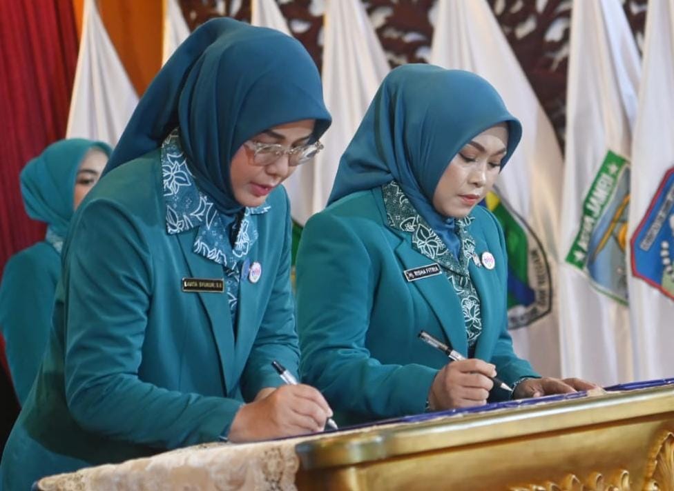 Pengukuhan itu diawali dengan pengukuhan Ketua TP PKK, sekaligus Bunda Paud, Ketua Tim Posyandu dan Ketua Dekrenasda Provinsi Jambi Hj Hesnidar Haris oleh Gubernur Jambi H Al Haris.