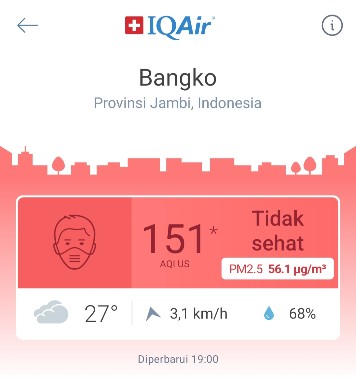 Namun pada jam 19.00 Wib sesuai aplikasi IQAir kondisi udara di Bangko naik menjadi 151 dalam kategori ‘Tidak Sehat’. (tugas).