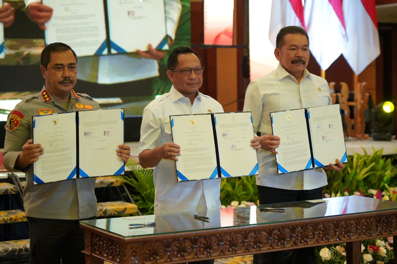 Jakarta – Jaksa Agung ST Burhanuddin menghadiri Penandatanganan Nota Kesepahaman antara Menteri Dalam Negeri, Kepala Kepolisian Negara Republik Indonesia, dan Jaksa Agung Republik Indonesia tentang Penanganan Laporan atau Pengaduan dalam Penyelenggaraan Pemerintah Daerah, Rabu (25/1/2023) bertempat di Hotel Borobudur, Jakarta.
