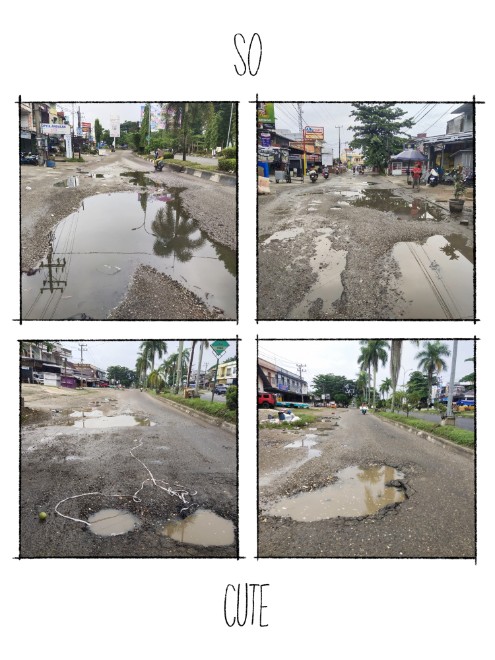 Akibat jalan rusak yang belum diperbaiki, air hujan kembali merendam jalan yang berlubang menganga, sehingga sangat menganggu bagi pengendara yang lewat.