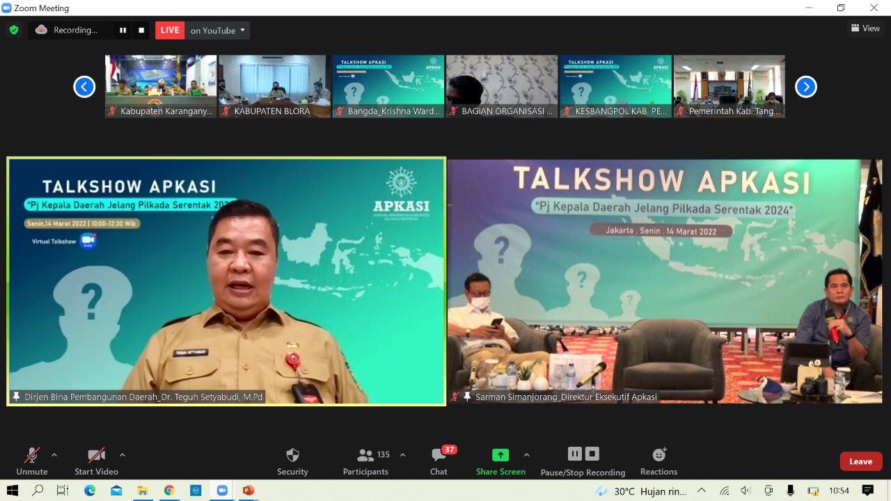 Jakarta – Asosiasi Pemerintah Kabupaten Seluruh Indonesia (Apkasi) menggelar talkshow daring bertema “Pj. Kepala Daerah Jelang Pilkada Serentak 2024”, Senin (14/3/2022). Talkshow ini dilaksanakan dalam rangka menyambut pemilihan kepala daerah tahun 2024.