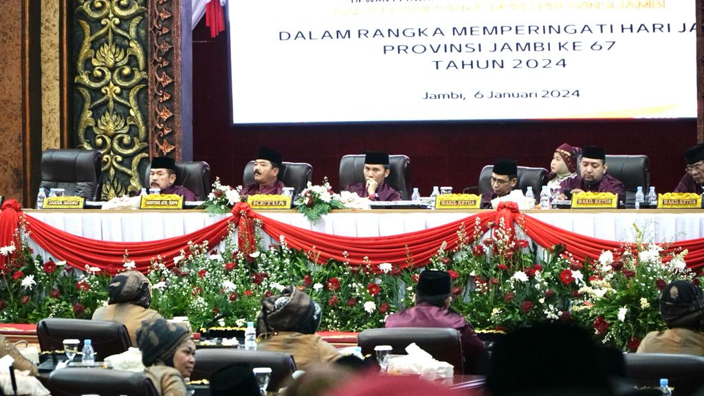 Jambi – Ketua DPRD Provinsi Jambi, Edi Purwanto didampingi Wakil Ketua DPRD Provinsi Jambi, Faisal Riza, Pinto Jayanegara, dan Burhanudin Mahir membuka dan memimpin secara resmi Rapat Paripurna DPRD Provinsi Jambi dalam rangka memperingati Hari Jadi Provinsi Jambi ke 67 tahun 2024, Sabtu (6/1).