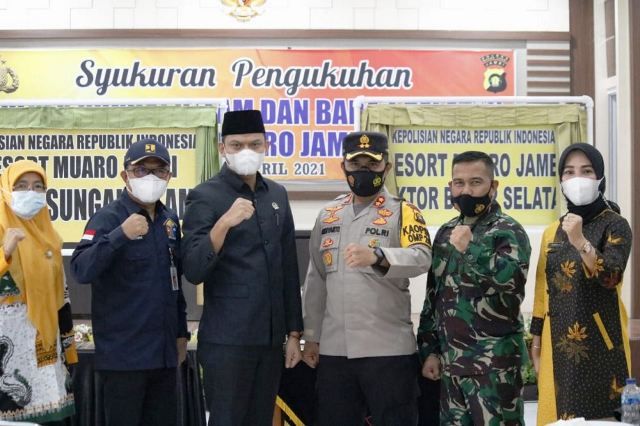 Muaro Jambi – Ketua DPRD Muarojambi Yuli Setia Bakti menghadiri pengukuhan Polsek Sungai Gelam dan Bahar Selatan di Mapolres Muarojambi, Kamis (8/4/2021).