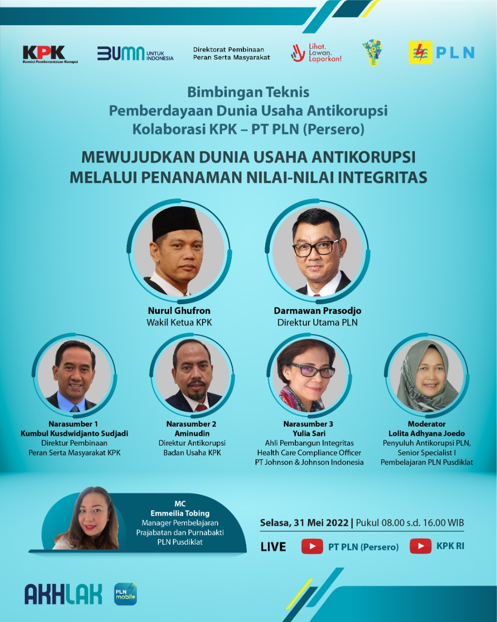 Adapun topik yang diangkat dalam kegiatan yaitu Bimbingan Teknis Dunia Usaha Antikorupsi yang diselenggarakan secara hybrid dari kantor pusat PLN, Jakarta, Selasa, (31/5/2022).
