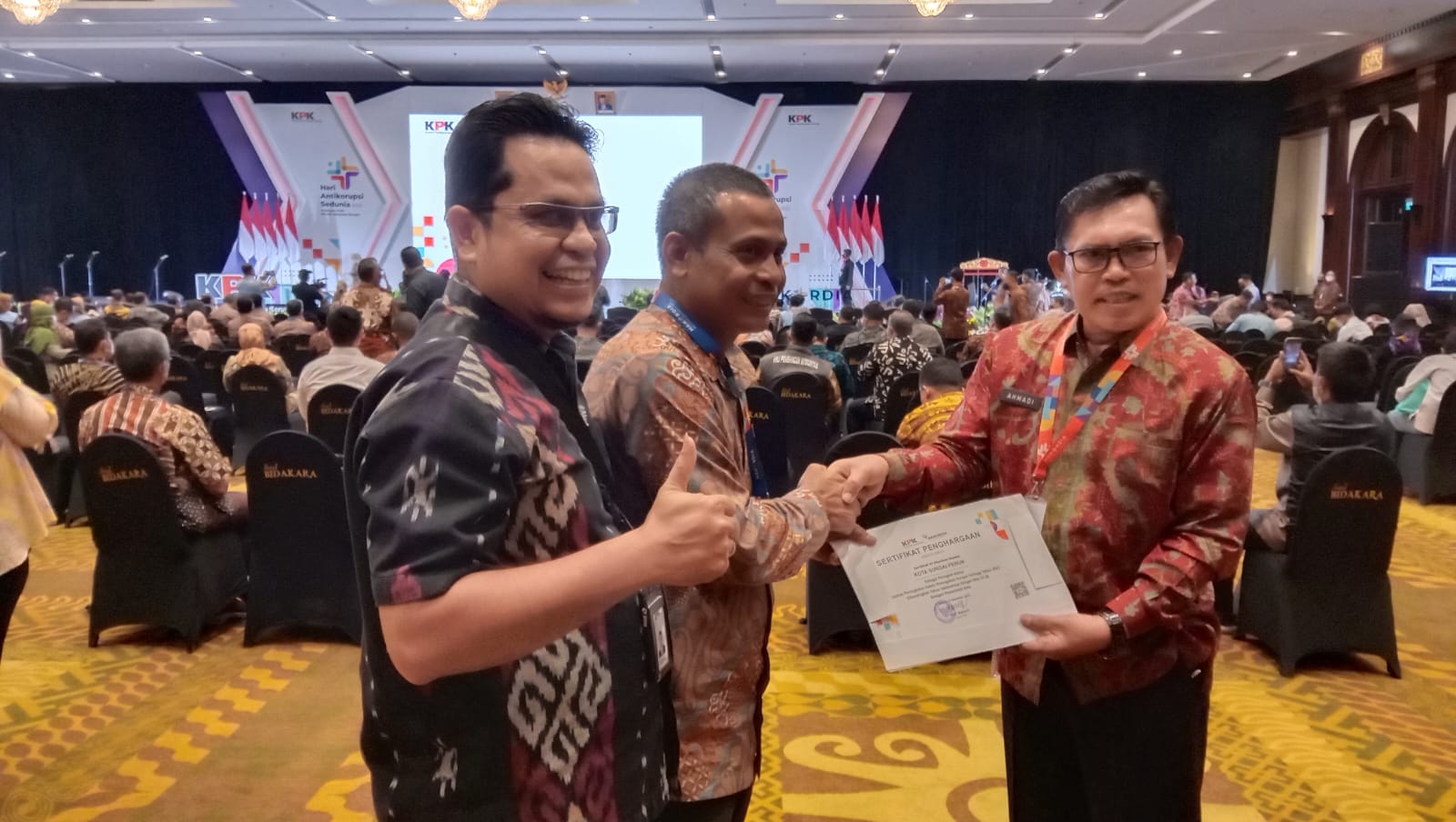 Penyerahan penghargaan bertepatan dengan peringatan Hari Antikorupsi Sedunia (Hakordia) Tahun 2022, di Hotel Bidakara, Jakarta, Jumat (9/12/2022) yang diserahkan langsung Plt. Direktur Koordinasi dan Supervisi Wilayah 1, Edi Suryanto.