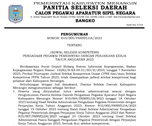“Panselda resmi umumkan jadwal kompetensi bagi Calon ASN PPPK Tahun 2023 Kabupaten Merangin untuk pelamar formasi Guru dan Tenaga Kesehatan. Pengumuman dengan Nomor : 810/009/Panselda/2023 tanggal, 8 Nopember 2023 yang ditandatangani oleh Ketua Panitia Seleksi Daerah Ir.Fajarman.MSc ,”jelas Ferdi Anshori.