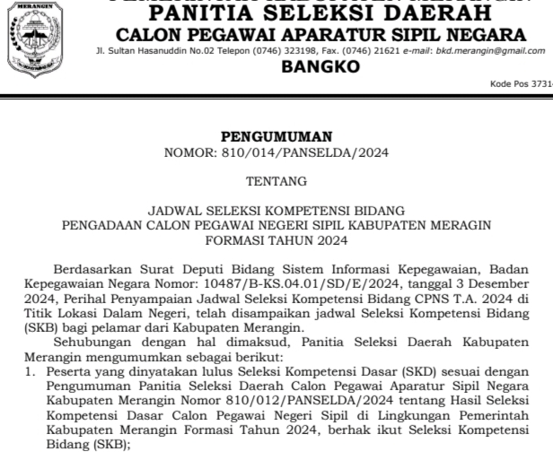 Merangin – Panitia Seleksi Daerah (Panselda) penerimaan Calon Pegawai Negeri Sipil (CPNS) Tenaga Teknis Tahun 2024 Kabupaten Merangin merilis pengumuman jadwal Seleksi Kompetensi Bidang (SKB) Nomor : 810/014/PANSELDA/2024 yang ditandatangani Ketua Pansel Ir. Fajarman, M.Sc, tanggal 5 Desember 2024.