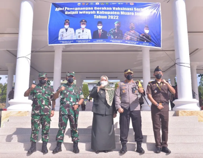 Sengeti – Bupati Muaro Jambi, Hj Masnah Busyro, SE.M. Tr.IP jadi inspektur upacara pencanangan gerakan vaksinasi serbu desa di wilayah Kabupaten Muaro Jambi, di lapangan kantor bupati, Kamis (13/01/2022).