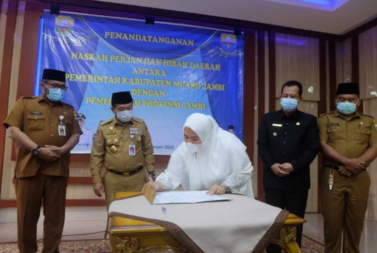 Sengeti – Bupati Muaro Jambi Hj. Masnah Busyro, SE, M.Tr.IP menandatangani naskah perjanjian hibah daerah (NPHD) dengan pemerintah Provinsi Jambi, Selasa (22/02).