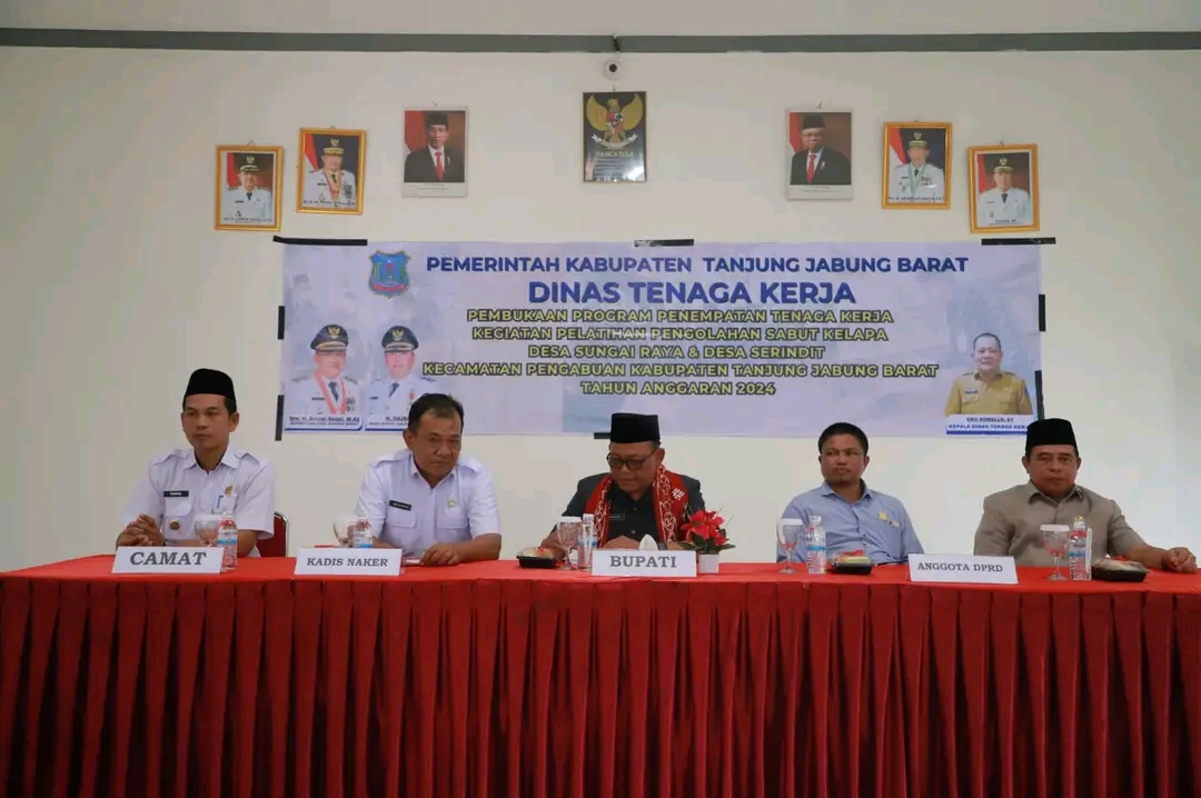 Pengabuan – Pemerintah Kabupaten Tanjung Jabung Barat terus menggalakkan upaya penciptaan wirausahawan baru untuk meningkatkan ekonomi lokal, salah satunya melalui Program Penempatan Tenaga Kerja dan Pelatihan Pengolahan Sabut Kelapa di Desa Sungai Raya dan Desa Serindit, Kecamatan Pengabuan. Program ini diresmikan di Aula Kantor Camat Pengabuan, Rabu (21/8).