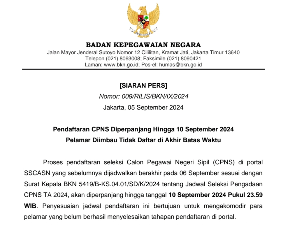 Waktu perpanjangan pendaftaran seleksi Calon Pegawai Negeri Sipil (CPNS) di portal SSCASN sesuai rilis dari Surat Kepala Badan Kepegawaian Negara (BKN) 5419/B-KS.04.01/SD/K/2024 tentang Jadwal Seleksi Pengadaan CPNS TA 2024, akan diperpanjang hingga tanggal 10 September 2024 Pukul 23.59 WIB.