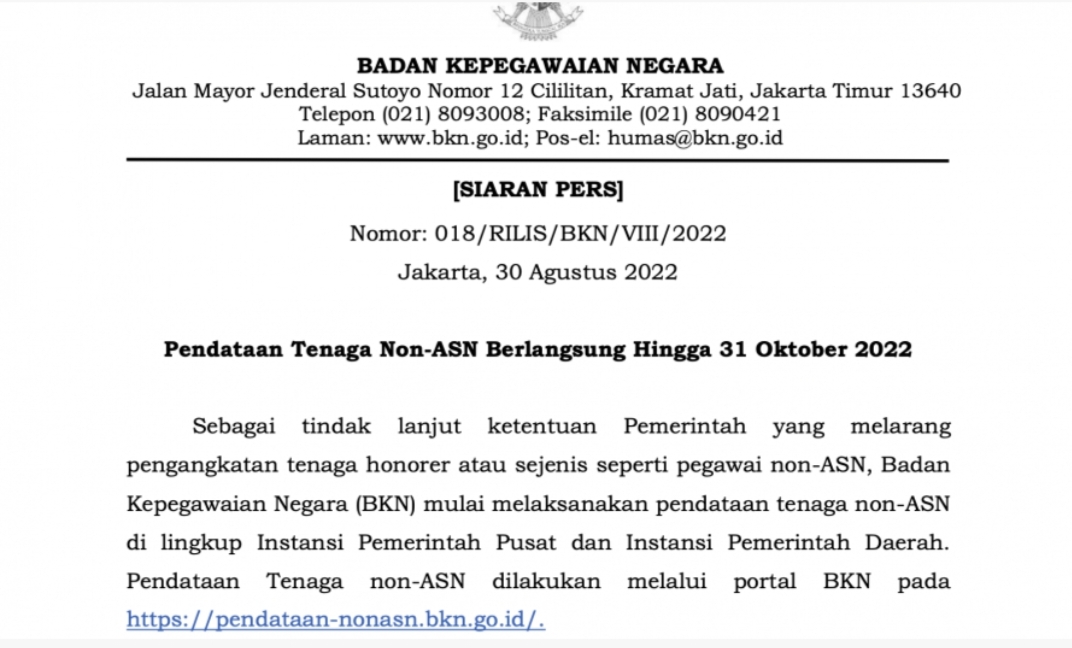 Jakarta – Sebagai tindak lanjut ketentuan Pemerintah yang melarang pengangkatan tenaga honorer atau sejenis seperti pegawai non-ASN, Badan Kepegawaian Negara (BKN) mulai melaksanakan pendataan tenaga non-ASN di lingkup Instansi Pemerintah Pusat dan Instansi Pemerintah Daerah.