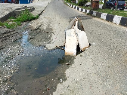 Pantauan media ini dilokasi jalan yang rusak dengan lubang besar digenangi air hanya ditutup dengan kayu dan papan dari triplek bekas sebagai tanda bagi pengendara bermotor. (tugas).