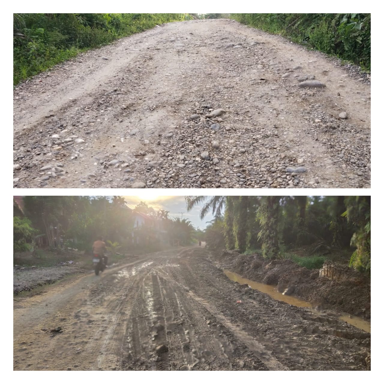 Lanjut Basri, kondisi jalan yang rusak parah lainya yaitu  dengan kondisi jalan berlubang besar yang barusan dilakukan penimbunan, namun karena hujan masih turun dengan deras jalan tersebut kembali rusak dengan kondisi tanah berlumpur dan tergenang air.