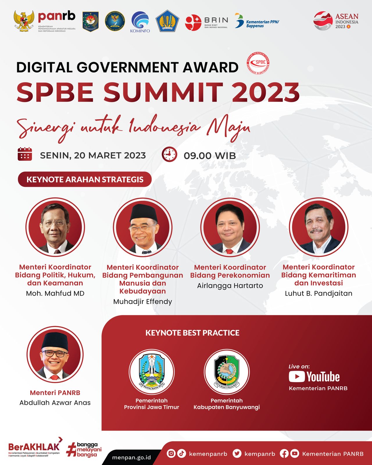 Masing-masing Menko akan menyampaikan arahan strategis sesuai bidangnya yakni Polhukam, PMK, Perekonomian, dan Marves. Sementara untuk praktik baik SPBE akan disampaikan oleh Gubernur Jawa Timur dan Bupati Banyuwangi.