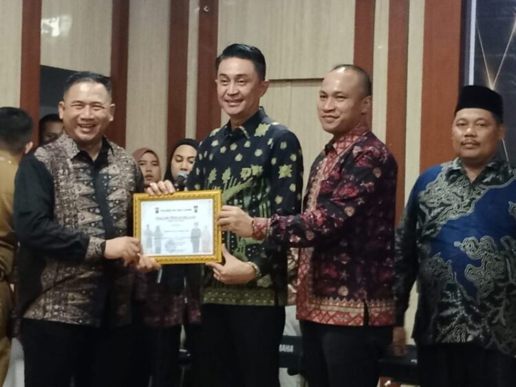 Muaro Jambi – Pj Bupati Muaro Jambi Bachyuni Deliansyah.SH. MH menerima piagam penghargaan dalam acara penyambutan Kapolres Muaro Jambi dari AKBP Yuyan Priatmaja SIK. MH kepada AKBP Muharman Artha SIK, Acara berlangsung di aula rumah dinas Bupati Muaro Jambi. Selasa (10/01/23) Malam.