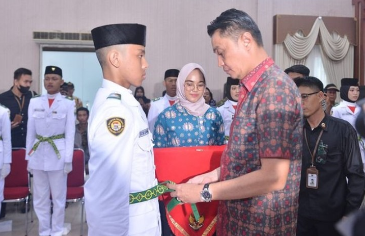 Muaro Jambi – Penjabat Bupati Muaro jambi Bachyuni Deliansyah, SH. MH mengukuhkan Pasukan Pengibar Bendera Pusaka (Paskibraka) Kabupaten Muaro Jambi tahun 2022 yang digelar di Aula Rumah Dinas Bupati,sengeti,jumat (12/08/22).