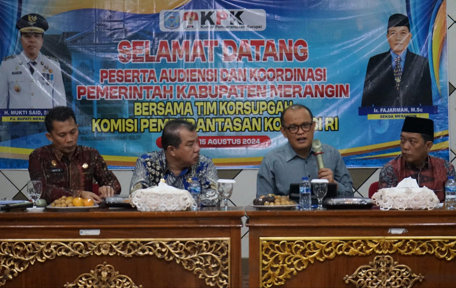 Merangin – Tim Korsubgah Komisi Pemberantasan Korupsi (KPK) kembali ke Kabupaten Merangin melakukan audiensi dan koordinasi bersama Pj Bupati H Mukti beserta jajaran Pemkab Merangin, Kamis (15/8/2024) di Auditorium rumah dinas bupati Merangin.