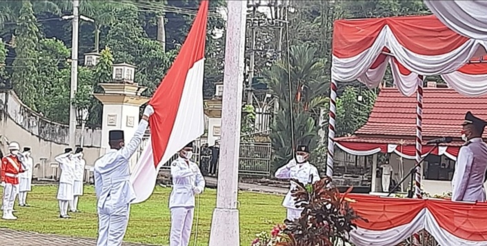 Merangin – Upacara pengibaran duplikat Bendera Pusaka Merah Putih, memperingati Hari Ulang Tahun (HUT) Kemerdekaan Republik Indonesia ke-76 tahun 2021 di masa pandemi Covid-19 berjalan khidmat.