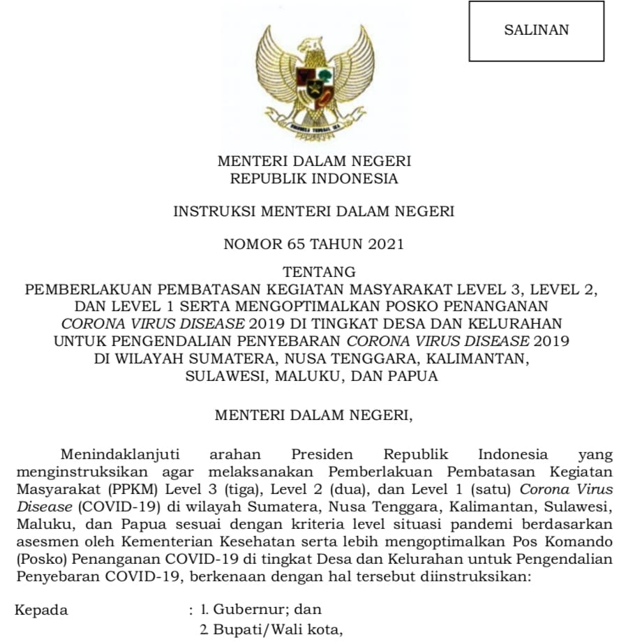 “PPKM masih berlanjut, untuk wilayah luar Jawa dan Bali menggunakan Intruksi Menteri Dalam Negeri Nomor 65 Tahun 2021,”jelas Benni Irwan Kapuspen Kemendagri.