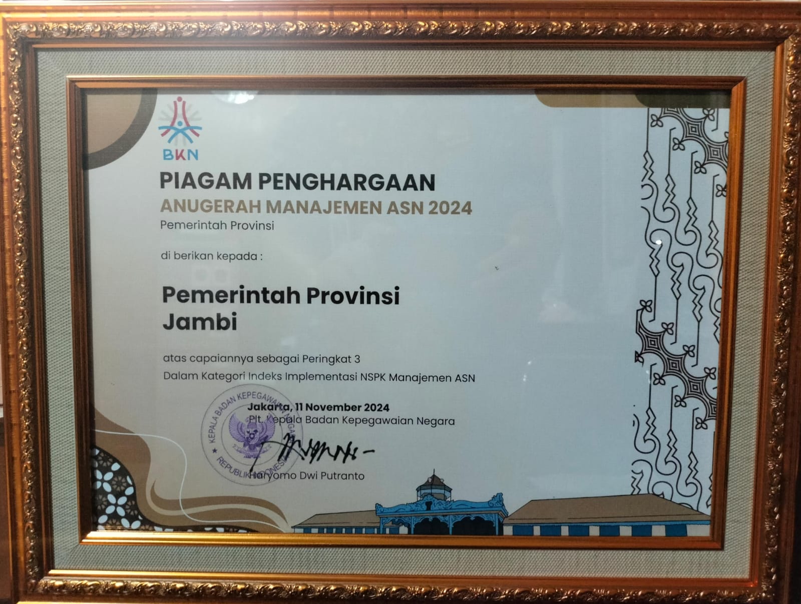 Jambi – Disiplin dan Budaya Kerja terus Ditingkatkan Jambi, Pada 13 November 2024 lalu Pemerintah Provinsi Jambi berhasil meraih peringkat 3 nasional Penghargaan Anugerah Manajemen ASN 2024 pada 2 (dua) kategori, yaitu: 1. Pengelolaan Disiplin dan 2. Norma, Standar, Prosedur, dan Kriteria (NSPK) Manajemen ASN Pemerintah Provinsi. Penganugerahan Penghargaan ini diselenggarakan oleh Badan Kepegawaian Negara (BKN) di Solo, Jawa Tengah, beberapa waktu lalu (Rabu,13/11/2024).