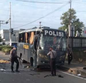 Jambi – Kecelakaan terjadi antara Bus Dinas SPN Polda Jambi Nopol XX VI 24428 dengan mobil truk bermuatan kayu karet Nopol BH 8785 FU di jalan Marsda Surya Dharma di Simpang IV Paal X depan Polsek kota Baru, Kota Jambi, sekitar pukul 06.57 WIB, Selasa pagi (7/12/2021) .