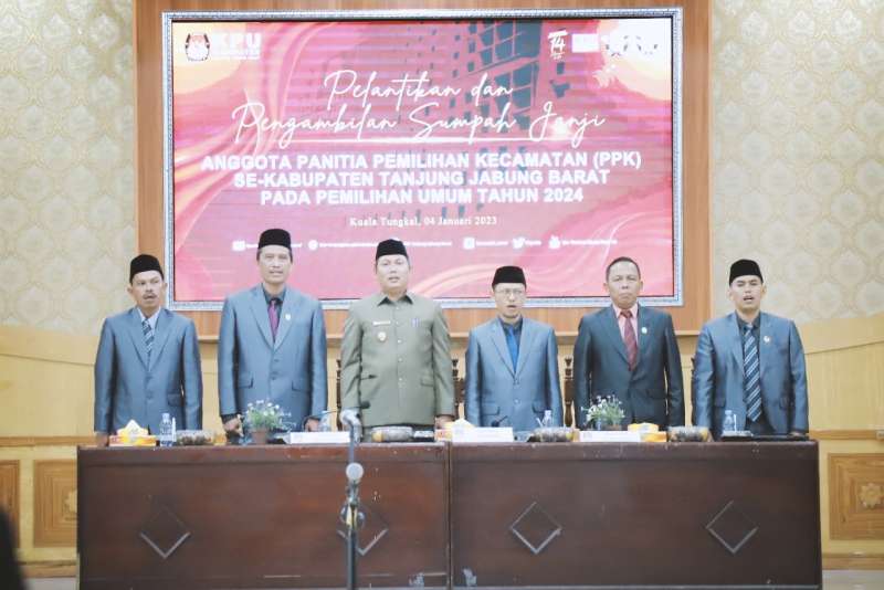 Kuala Tungkal – Mewakili Bupati, Wakil Bupati Tanjung Jabung Barat H.Hairan,S.H Menghadiri Pelantikan dan Pengambilan Sumpah Janji Anggota Panitia Pemilihan Kecamatan(PPK) se-Kabupaten Tanjung Jabung Barat pada pemilihan umum Tahun 2024, Rabu(04/01).
